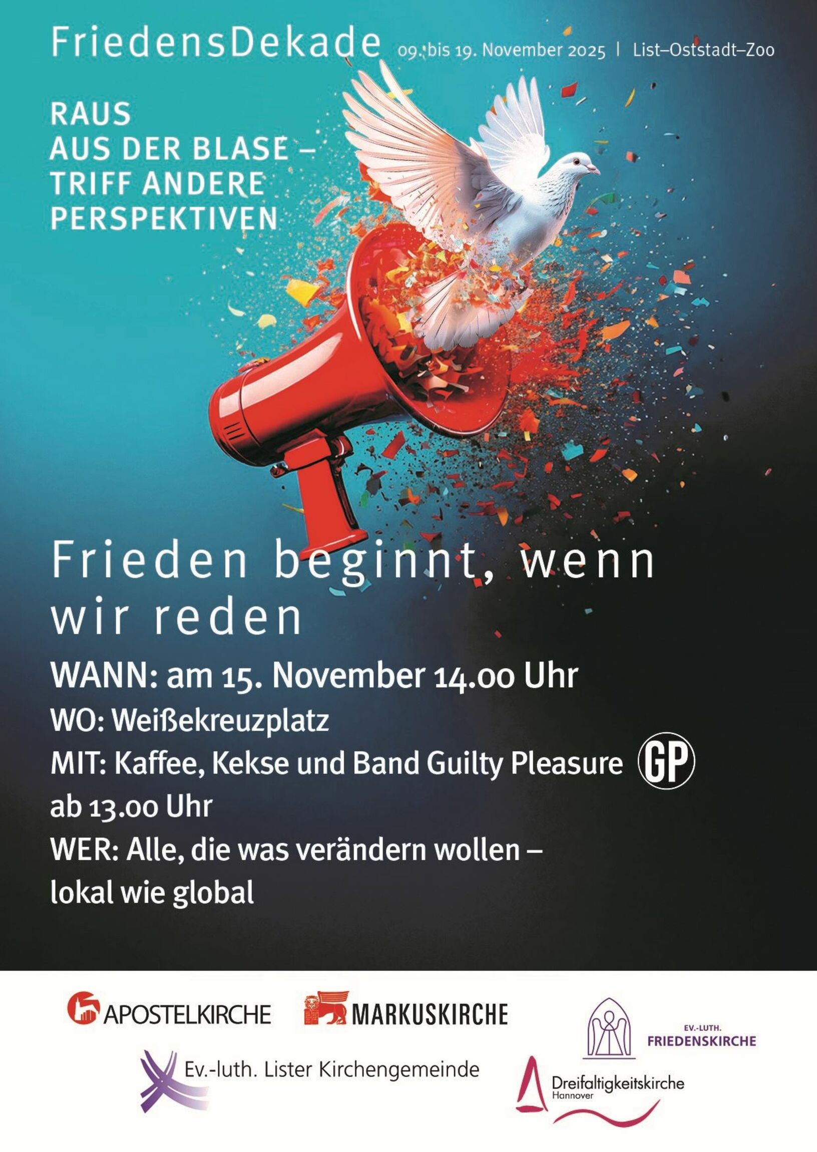 Die Aktion findet im Rahmen der FriedensDekade „Komm, den Frieden wecken“ statt, die die Kirchengemeinden in Oststadt/List jährlich mit Veranstaltungen und Gottesdiensten begehen. Ab 13.15 Uhr gibt es bereits Musik mit der Band „Guilty Pleasure“, Kaffee und Kuchen sowie die Möglichkeit, gewünschte Gesprächsthemen an einer Diskussionswand festzuhalten.