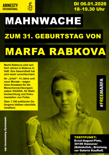 Die umstrittene Präsidentschaftswahl im Jahr 2020 führte in Belarus zu Protesten, auf die die Behörden mit massiven Repressionen reagierten. Davon betroffen ist auch die Organisation Viasna, eine der wichtigsten Informationsquellen über Menschenrechtsverletzungen in Belarus. Im Kontext der Wahlen schikanierten die Behörden Viasna-Mitglieder massiv. Mehrere Mitarbeiter*innen der Organisation befinden sich derzeit in Haft. Auch die Menschenrechtsverteidigerin Marfa Rabkova ist seit September 2020 allein wegen ihrer legitimen Menschenrechtsarbeit als Koordinatorin des ehrenamtlichen Netzwerks von Viasna inhaftiert. Am 6. September 2022 verurteilte das Stadtgericht von Minsk Marfa Rabkova zu 15 Jahren Haft. Es sprach sie wegen „Mitgliedschaft in einer kriminellen Vereinigung“ und „Organisation von Massenunruhen“ schuldig.