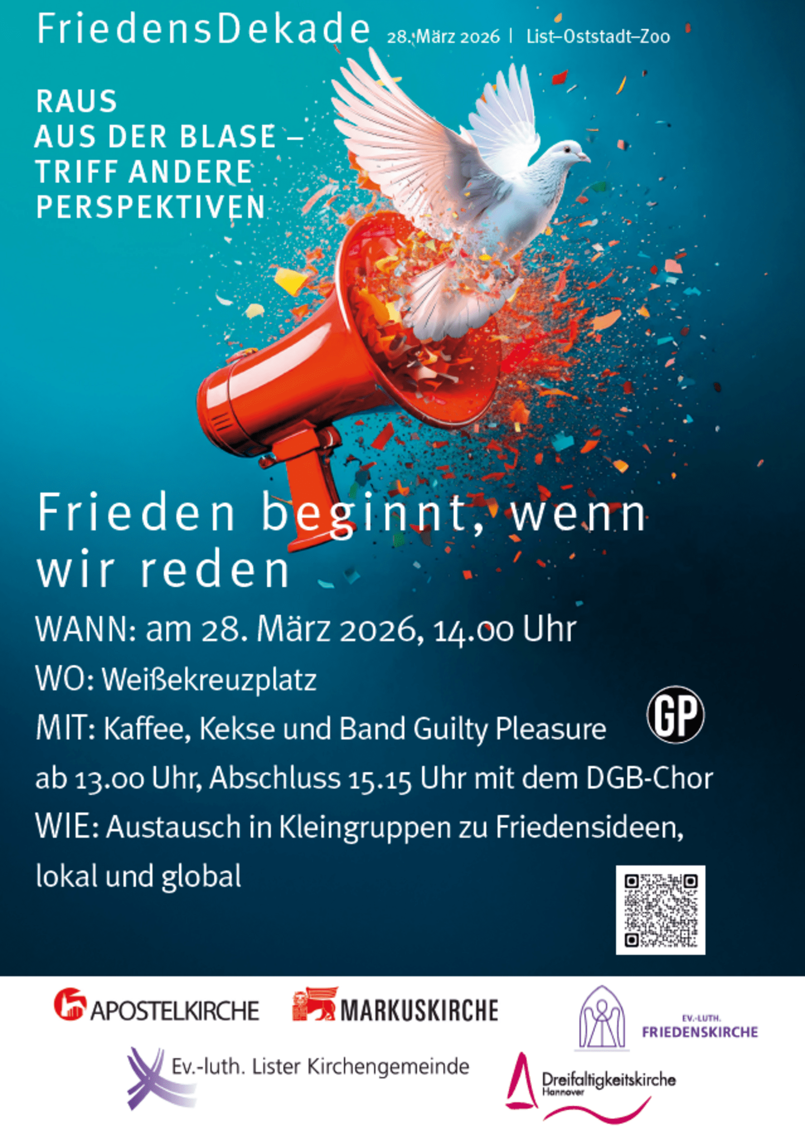 Datum28. März 2026 13:30 – 18:00 Uhr Wir sind mit Redebeiträgen bei der Veranstaltung „Frieden beginnt, wenn wir reden“ dabei.